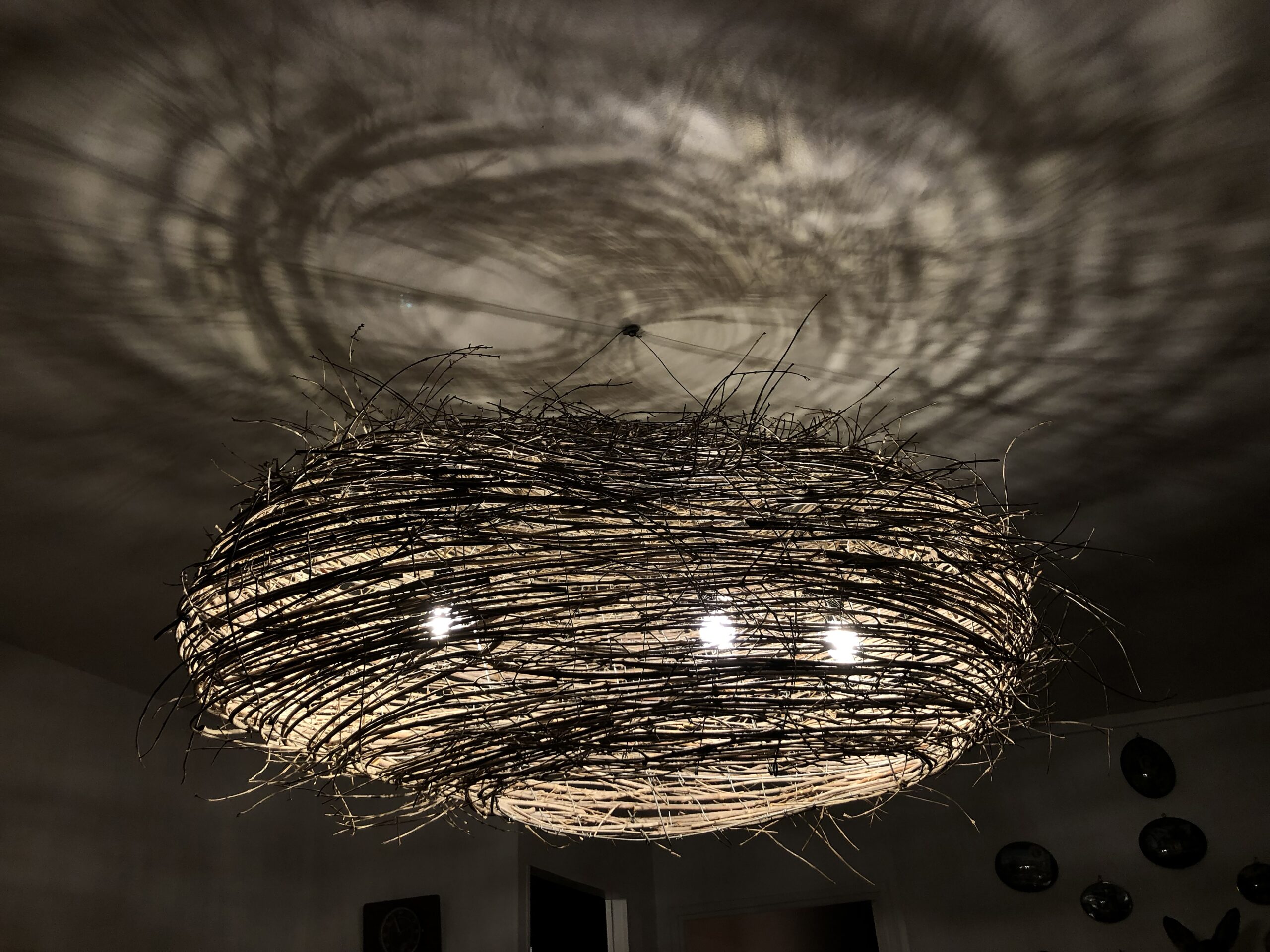 Je crée des nids lumineux de très grande taille que je fabrique patiemment à la main, en imitant et respectant la nature. Ces ouvrages d’artisanat d’art sont réalisés exclusivement sur commande pour des intérieurs, hôtels et restaurants de prestige qui partagent mes valeurs de respect et d’amour inconditionnel de la nature.
